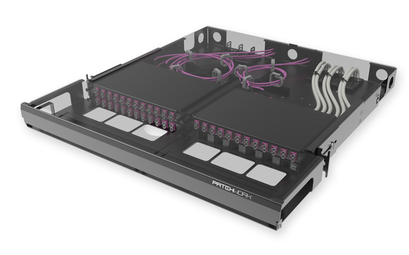 Универсальная выдвижная патч-панель Flex Tray имеет четыре посадочных места под установку адаптерных планок и претерминированных оптических кассет. Возможна установка как оптических, так и медных адаптерных планок с/без экранирования .